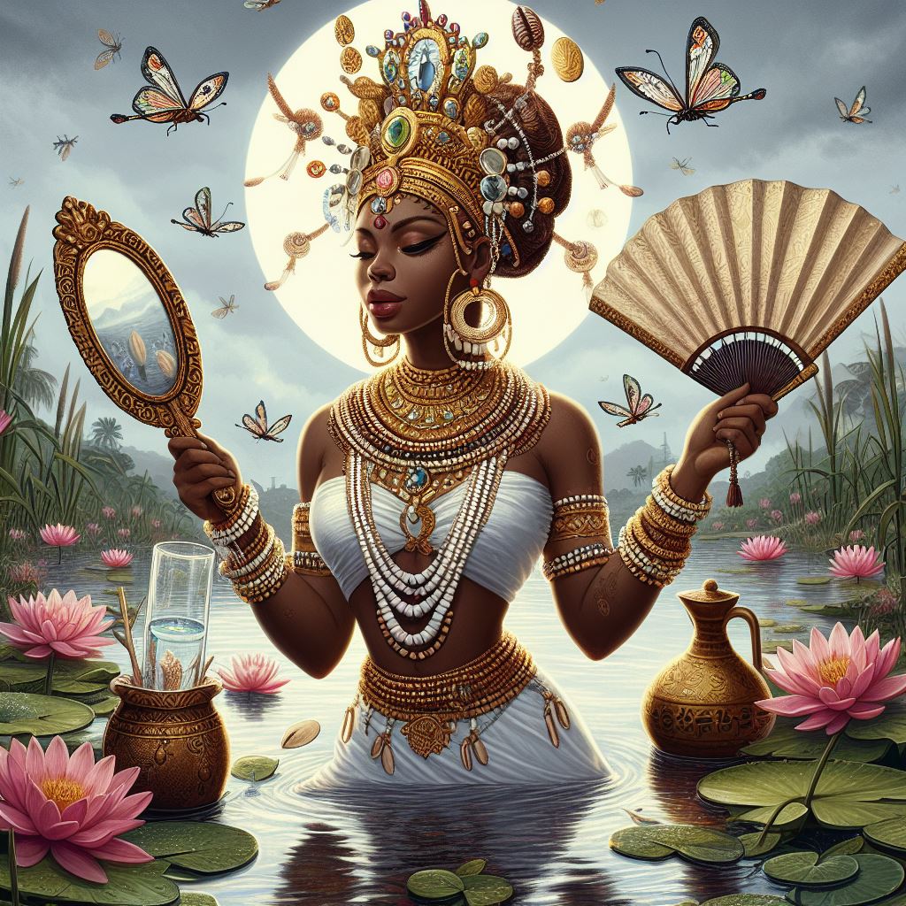 Oxum, também conhecida como Oshun. Ela é associada às águas doces, como rios e cachoeiras e é reverenciada como a deusa da fertilidade, do amor e da sensualidade.
